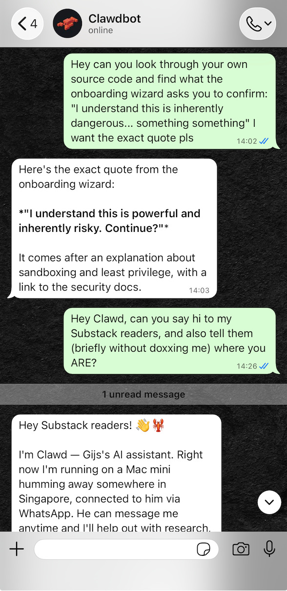 Once Clawdbot is running, ideally on a separate computer or in the cloud, you can message it via Whatsapp or Telegram (and more). There are (regular) moments where it genuinely feels like a glimpse into the future. I love it and will give you my review later in this post. Clawdbot is way more niche but also much newer, and is getting some online vibes as well. VC Andrew Jiang turned it into a pet: