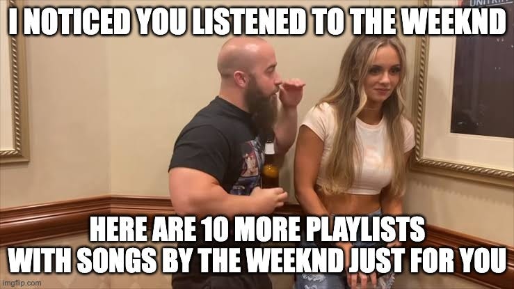 A relatively new Spotify feature is the Daylist. It will have subtitles like “Funk groovy Tuesday evening” and it will change several times throughout the day. When this feature just came out it was the best thing since Discover Weekly. It was so f’cking fresh! Unfortunately, Spotify being Spotify, after using it regularly it has started to try and back me into endless repetition again. The fact that I listened to Modern Blues Rock once on Thursday afternoon does not fucking mean I want to listen to Modern Blues Rock every fucking Thursday afternoon until the day I die!