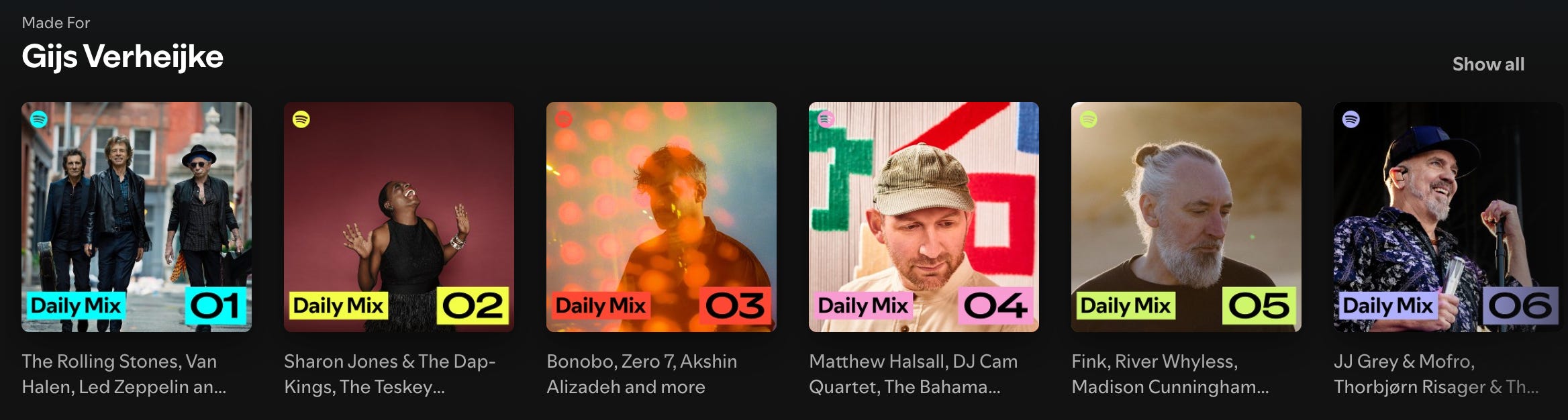 These Daily Mix playlists are one of the most pointless features of Spotify for me. When I first saw them my first thought was: “Oh cool! Those playlists have some familiar classics but also new songs that have a similar vibe, right? ……Right?”