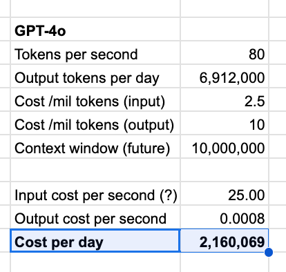 Iron-manning this point: If you assume that the previous assumption is true, that the agent needs to be continuously thinking out-loud and looping that train of thought through the model, capital will continue to be a moat. It will be very expensive to run such an agent, as much as $2 million per day.